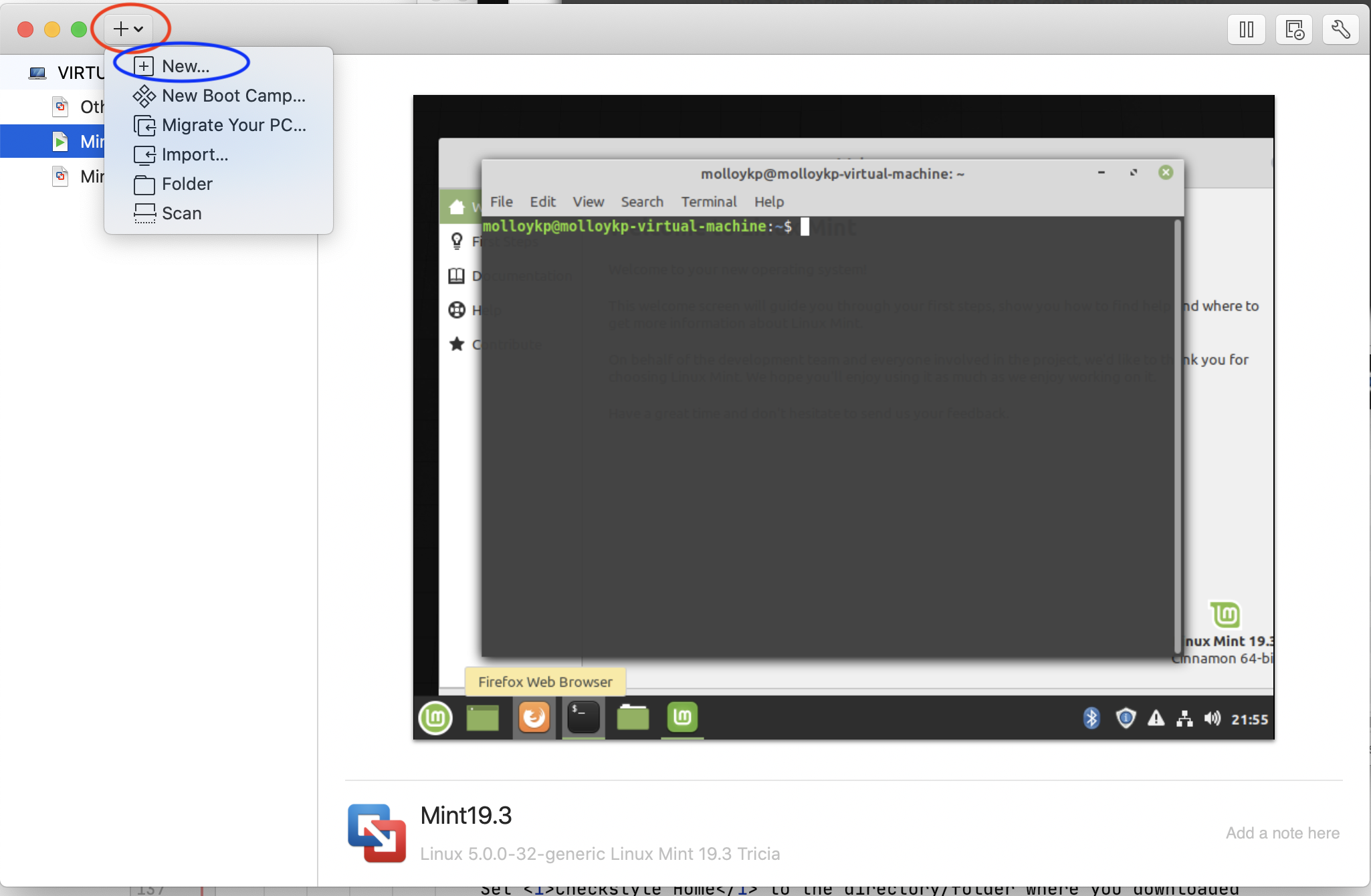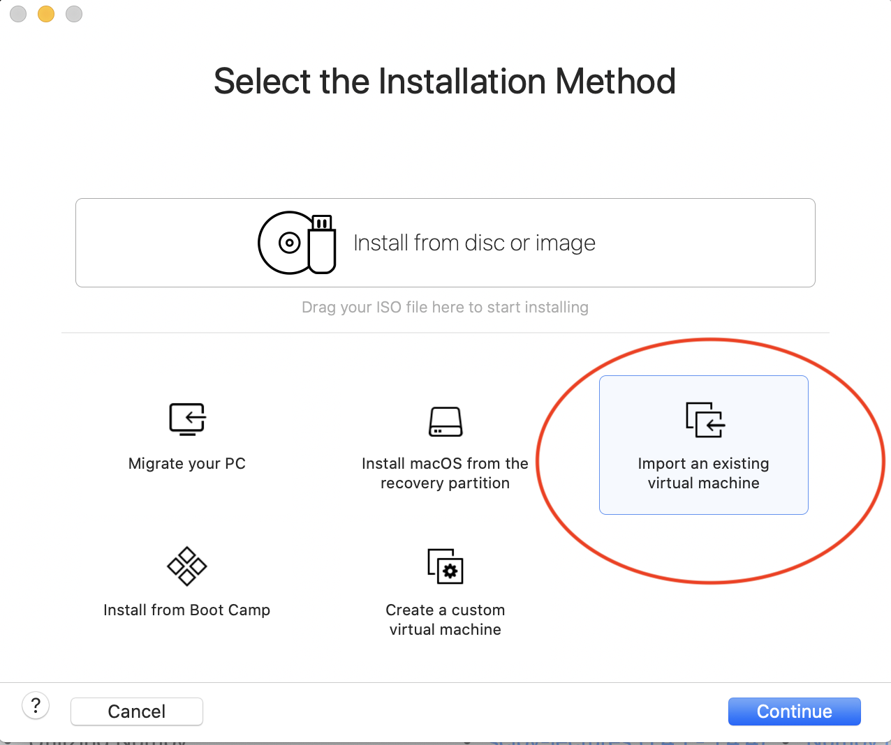 - Select Import an existing virtual machine (circled below in red). Then navigate to and select the linuxmint-20.2-cinnamon-64bit.iso file you downloaded