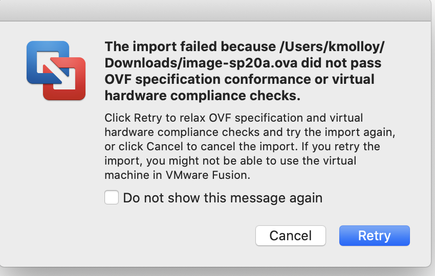 - You may receive a message indicating that the file did not pass OVF specification conformance, you can click retry and it should import this time